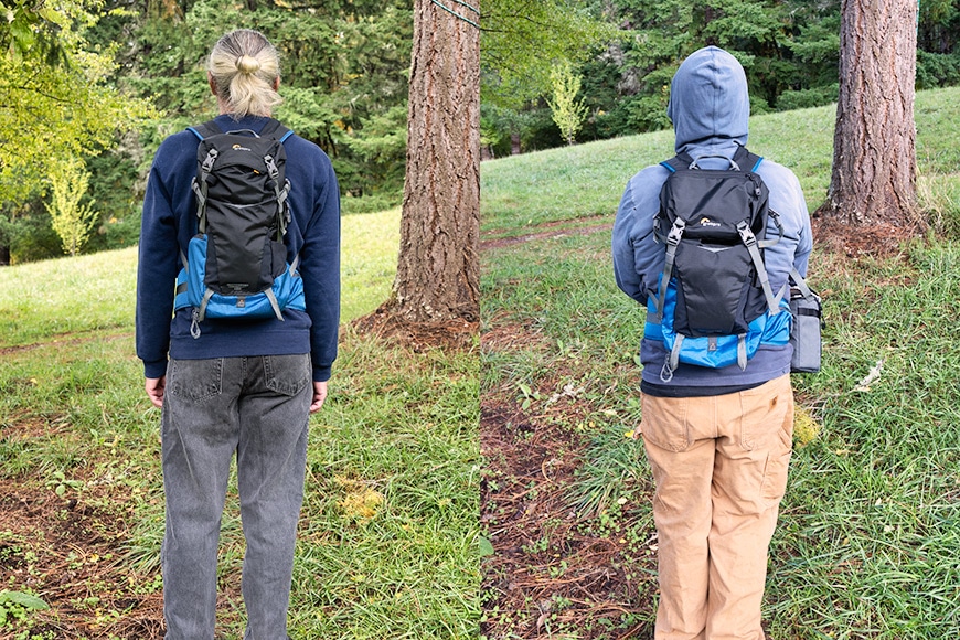 The Lowepro Photosport III 15L is a pretty small bag. On the left, the model is 5’9′, the model on the right is 5’3. (The model on the right is wearing the camera cube on the hip belt.)