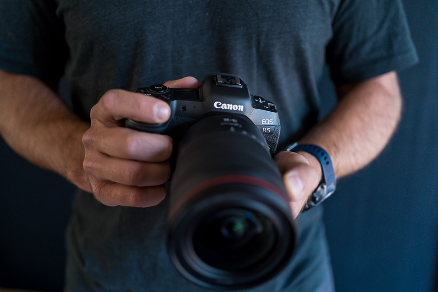 The Canon EOS R5 with the 15-35mm f/2.8 lens balances nicely.
