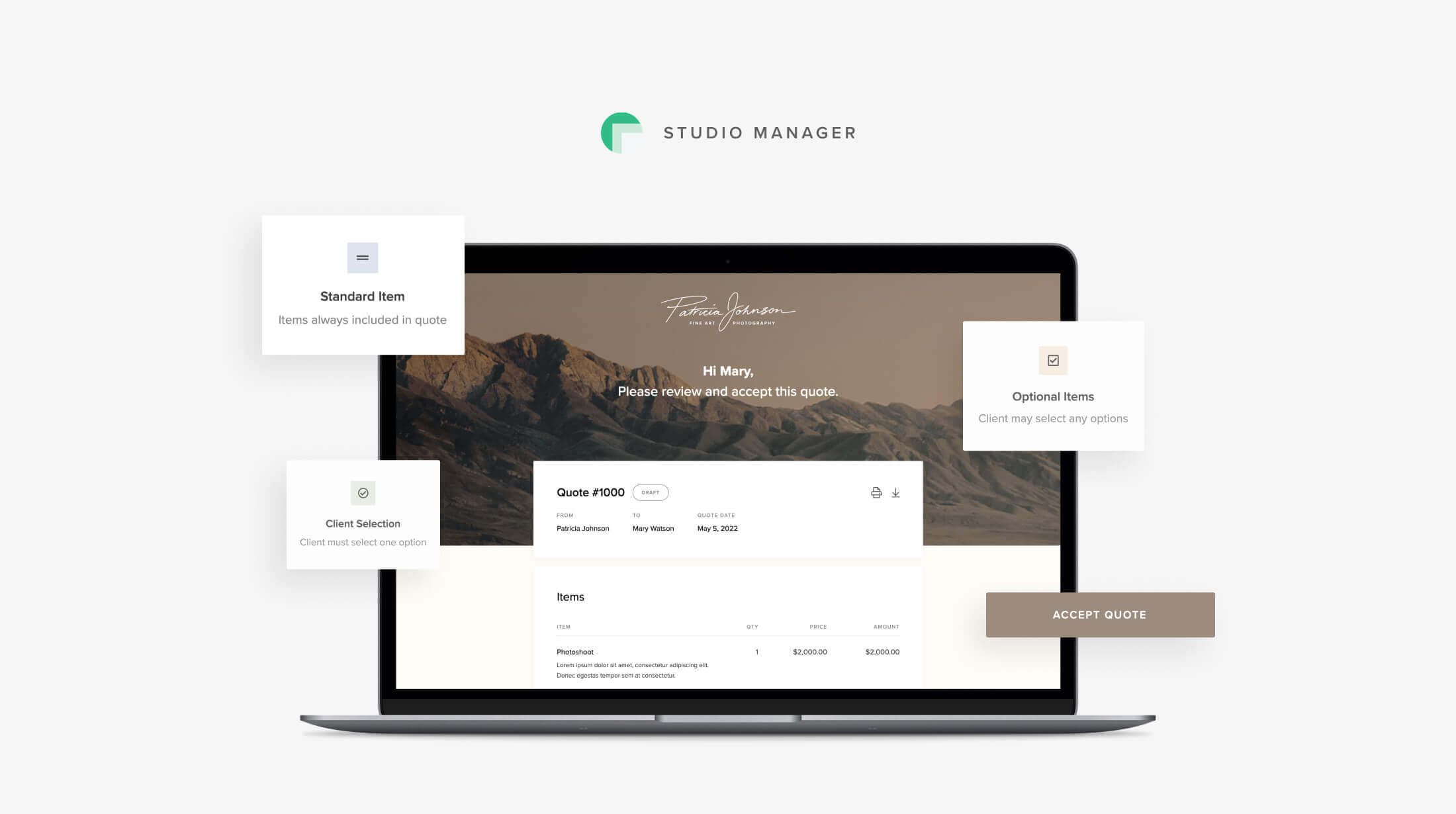 For this, Pixieset Studio Manager covers the bases pretty nicely too. The platform allows you to create quotes with price estimates that are easy to assemble and share with clients.