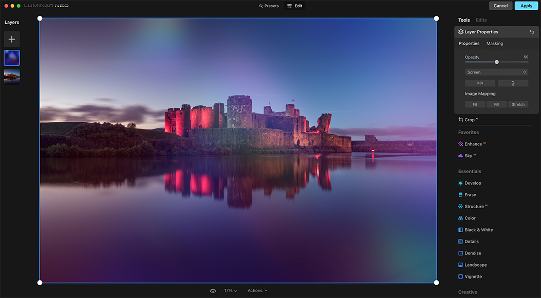 In this simple example, we will take an image of a castle at night and add one of Luminar Neo’s preinstalled Overlays as a new Layer.