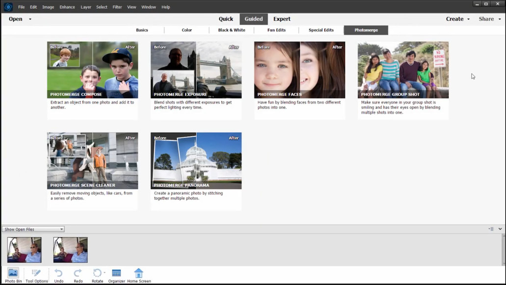 You’ll find the Photomerge tool under the Guided tab on Photoshop Elements’ start-up page at the top.